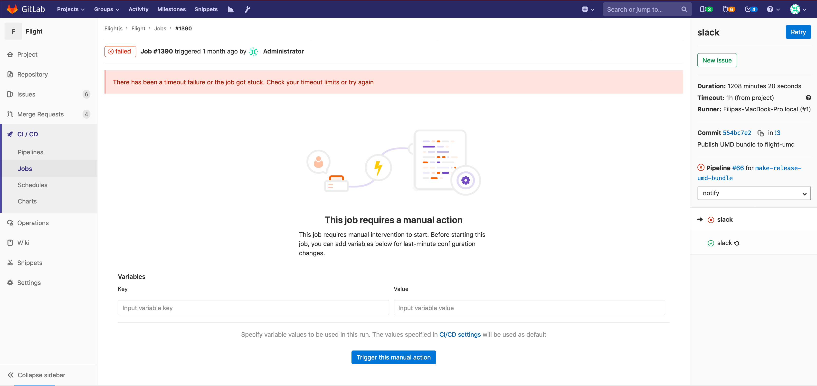 Clicking on a pipeline will bring you to the Pipeline Details page and show the jobs that were run for that pipeline. From here you can cancel a running pipeline, retry jobs on a failed pipeline, or delete a pipeline.