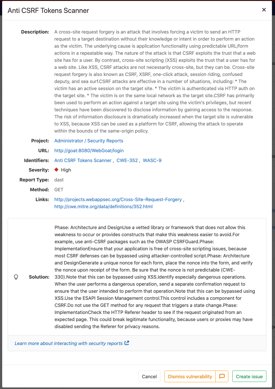 The results will be saved as a DAST report artifact that you can later download and analyze. Due to implementation limitations we always take the latest DAST artifact available. Behind the scenes, the GitLab DAST Docker image is used to run the tests on the specified URL and scan it for possible vulnerabilities.