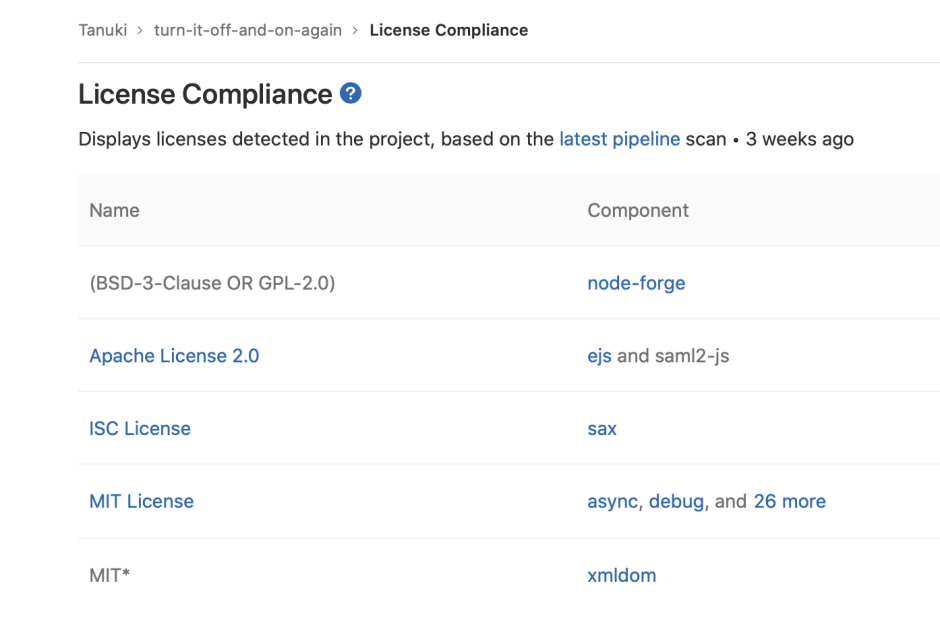 Once everything is set, navigate to Security & Compliance > License Compliance in your project's sidebar, and you'll see the licenses displayed, where: