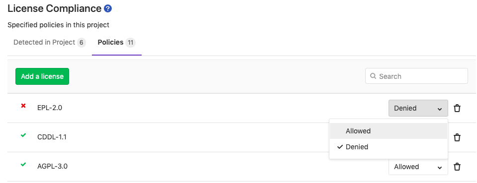 If you are a project or group Maintainer, you can click on a license to be given the choice to approve it or blacklist it.